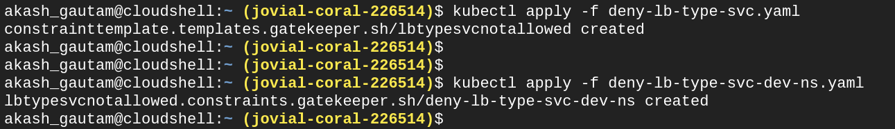 When we tried to create a service of type LoadBalancer in the dev namespace, we got the error that it was denied by the admission webhook due to `deny-lb-type-svc-dev-ns` constraint, but when we try to create the service in the default namespace, we were able to do so.